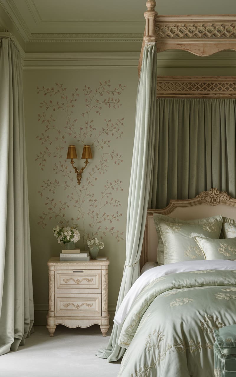 112. Serene Sage Green and Cream Renaissance-Style Bedroom with Soft Textiles
