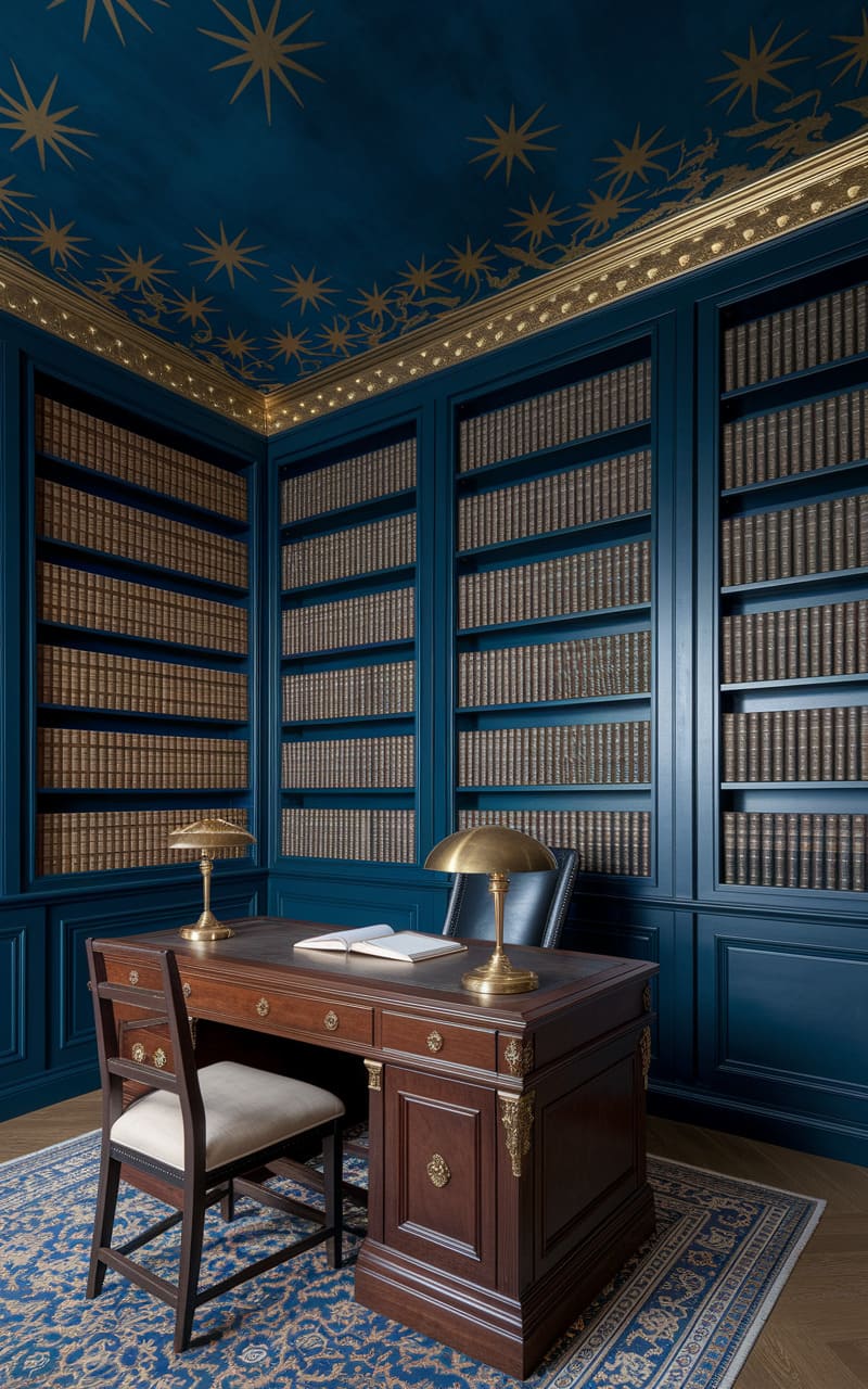 113. Dramatic Deep Blue and Gold Renaissance-Influenced Study with Dark Wood Accents