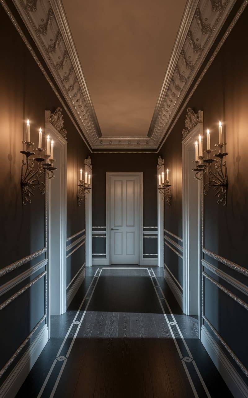 The long, narrow corridor stretches forth, a study in formal elegance and hushed anticipation. Candle flames flicker from ornate sconces, casting a warm, intimate glow against the charcoal walls and highlighting the intricate plasterwork that traces the room’s perimeter. A single, stark white door stands sentinel at the far end, framed by the dark wood floor inlaid with a subtle geometric pattern, promising passage to another realm of this grand, yet subtly shadowed, space.