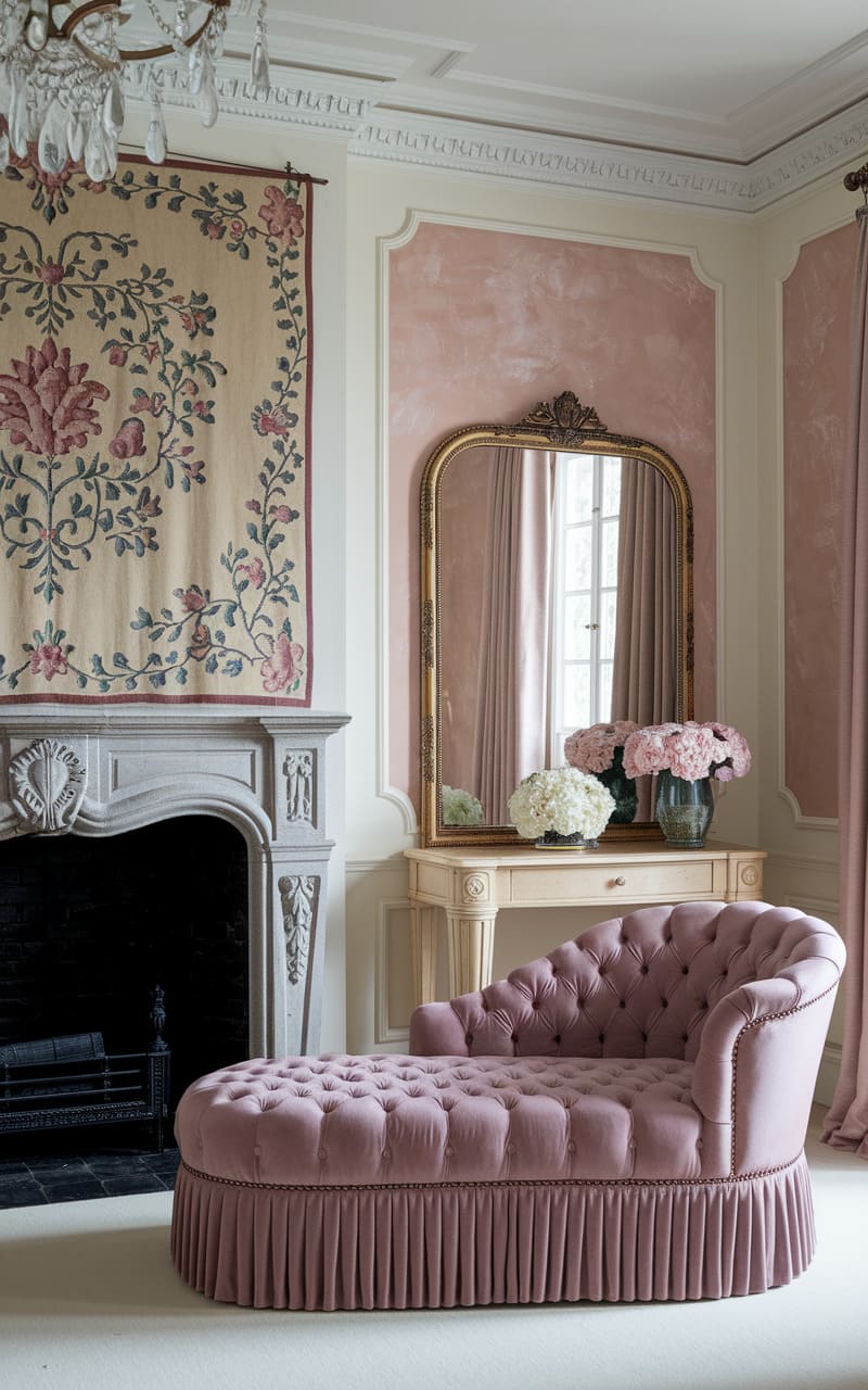 Within this chamber, a whisper of faded grandeur lingers, a soft blush of rose tones painting the walls and draping the plush chaise lounge, its tufted surface beckoning repose. A tapestry, its floral motif a silent echo of a forgotten garden, hangs beside a stately fireplace, its dark maw hinting at past warmth. A gilded mirror, its frame ornate and aged, reflects the room’s delicate beauty, doubling the display of fresh blooms and the gentle, almost ethereal, ambiance of this private sanctuary.