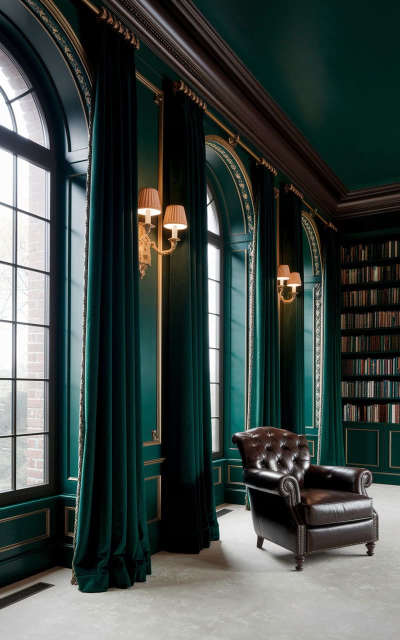 A theatrical hush falls over this emerald chamber, where velvet drapes cascade like liquid jewels beside towering arched windows. The room exudes a sense of opulent drama, the deep green walls and ceiling creating an almost immersive, jewel-box effect. A stately leather armchair, its tufted surface gleaming softly, anchors the space, while the warm glow of sconces casts long, intriguing shadows that dance across the meticulously paneled walls. It’s a space that whispers of clandestine meetings and the turning of well-worn pages, a sanctuary of quiet grandeur and intellectual pursuit.