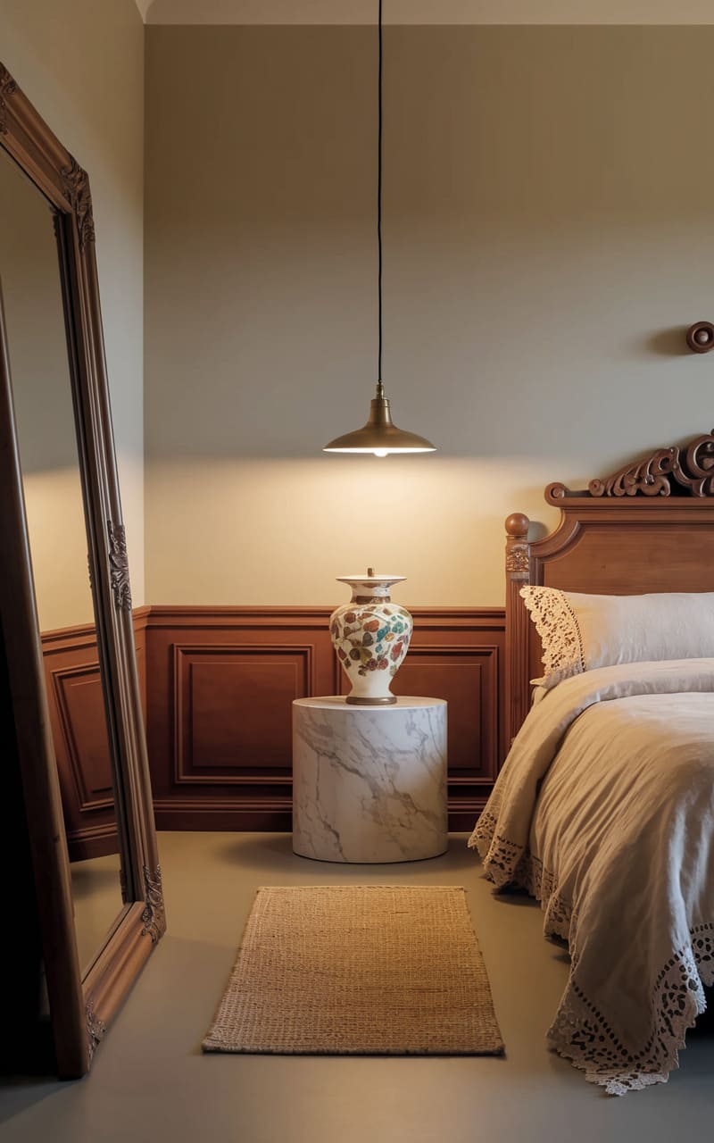 A single, warm glow emanates from a pendant lamp, casting a soft halo over the intimate scene. The room, a blend of rustic charm and classical echoes, features a carved wooden bedstead draped in linen, its foot resting against a wall paneled in rich wood. A marble pedestal supports a delicate vase, while a full-length mirror leans casually against the wall, reflecting the quiet drama of the composition. The overall effect is one of understated elegance, a private sanctuary bathed in gentle illumination.