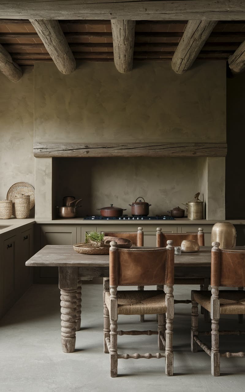 This is a kitchen where time slows to the rhythm of hand-hewn beams and earthen plaster, a rustic symphony in muted tones. The rough-hewn table, a testament to generations of shared meals, is set with simple pottery and worn leather chairs, inviting you to partake in the day’s bounty. Above, the massive mantle, a stage for copper pots and well-loved utensils, hints at hearty stews and the warmth of a crackling fire, while the exposed timber ceiling whispers tales of ancient forests and the enduring beauty of simple living. It’s a space where the spirit of the Renaissance is found not in gilded opulence, but in the honest beauty of craftsmanship and the quiet dignity of a life lived close to the earth.