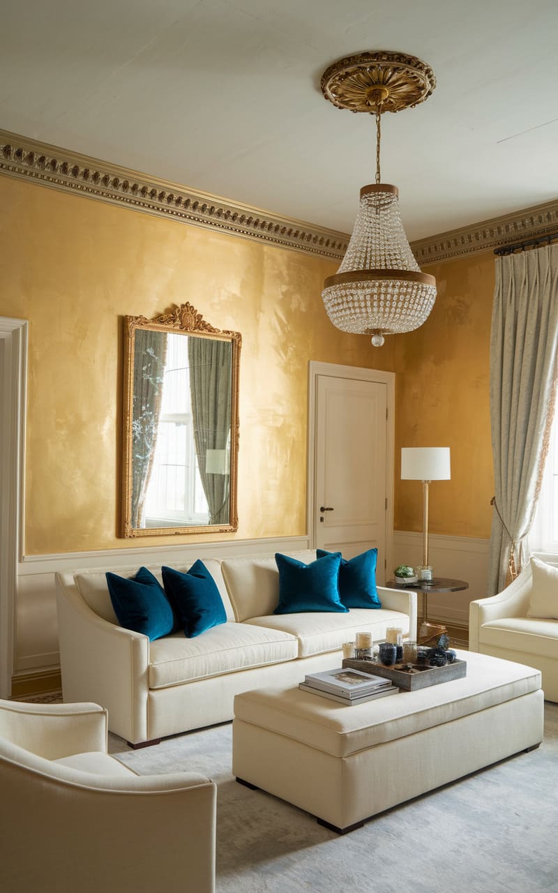 Bathed in a warm, gilded glow, this room whispers of Renaissance grandeur. A crystal chandelier, like a frozen cascade of light, hangs above a plush, cream-colored sofa adorned with sapphire cushions. The walls, textured with a hint of gold, reflect a framed mirror, while a decorative frieze and ceiling medallion add a touch of old-world elegance to this intimate, yet opulent space.