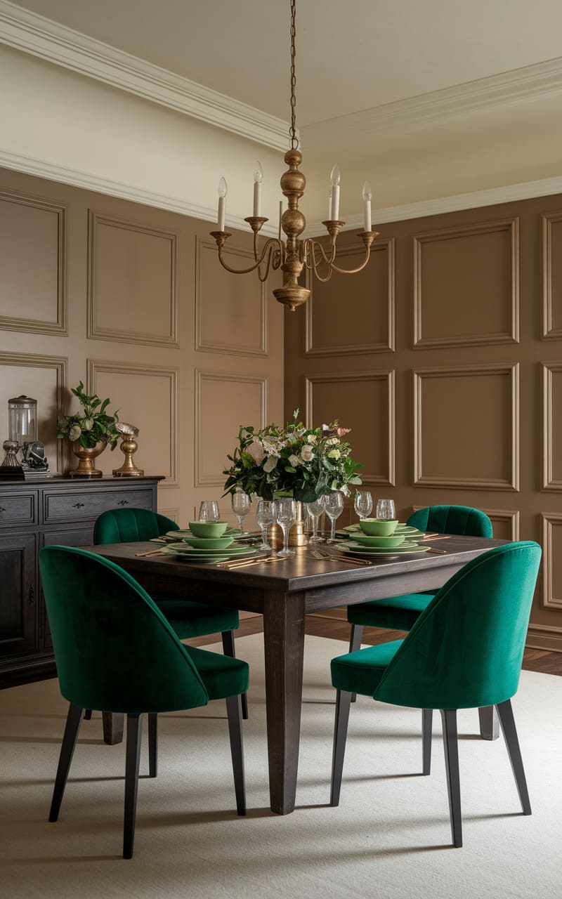 A quartet of emerald velvet chairs gather around a polished table, their plush surfaces a striking contrast to the room’s warm, paneled walls. A golden chandelier, dripping with a soft, candle-like glow, casts a flattering light upon the meticulously set table, where delicate glassware and verdant plates await a feast. The room, a symphony of rich textures and muted tones, exudes an air of refined intimacy, a space where whispered conversations and shared meals would linger long into the evening, fueled by the quiet elegance of a bygone era.