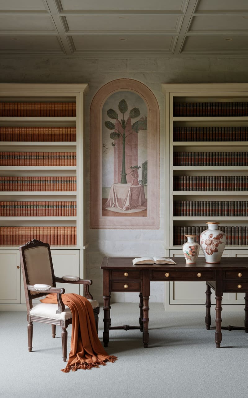 A scholar’s refuge, the room hums with the quiet energy of accumulated knowledge, rows of aged spines lining built-in shelves like silent sentinels. A fresco, its muted colors whispering of distant gardens, graces the central niche, while a well-worn desk, strewn with an open tome and flanked by delicate vases, invites contemplation. The soft, even illumination, a gentle wash across the paneled ceiling, fosters an atmosphere of serene concentration, a space where time bends to the rhythm of thought.