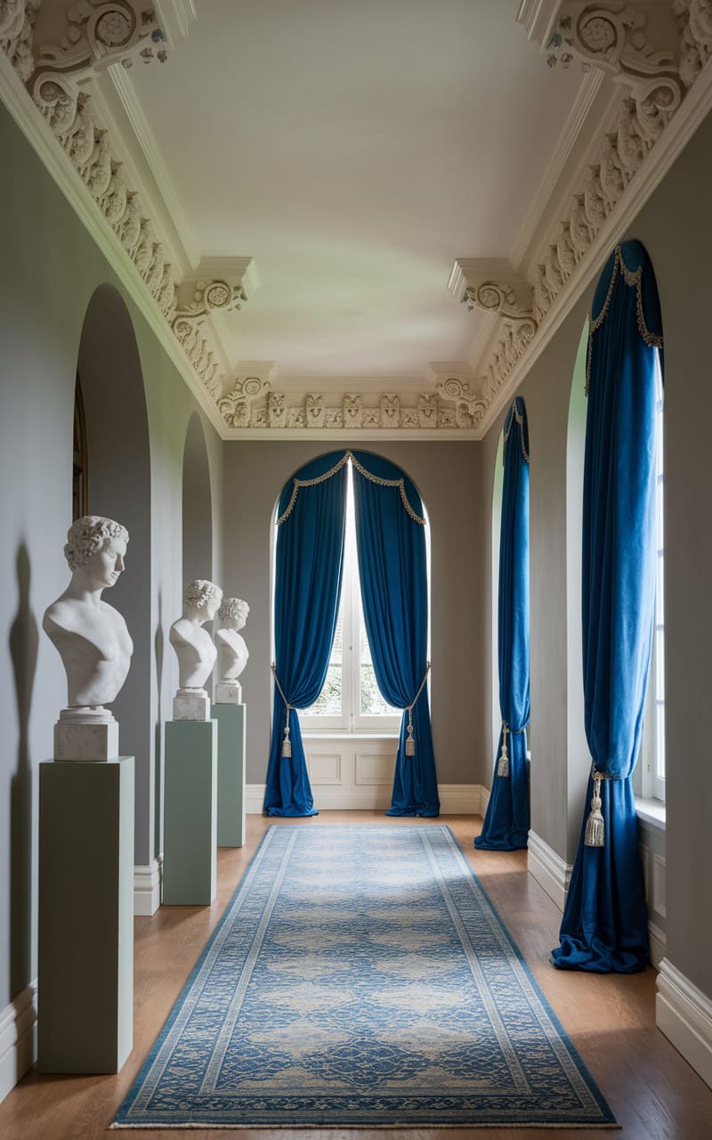 A hushed gallery whispered of bygone grandeur, its cool grey walls a canvas for the parade of plaster busts lining the left, while rich sapphire drapes framed arched windows, their tassels a delicate counterpoint to the ornate cornice above. A runner, woven with a muted pattern, stretched down the polished floor, beckoning the viewer through the serene, almost theatrical space, a stage set for contemplation.