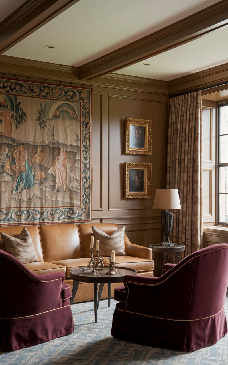 In this chamber, a hush descends, the air thick with the weight of history. A tapestry, faded yet vibrant, hangs like a whispered legend, its figures frozen in a timeless narrative. Deeply hued walls, paneled and rich, cradle a leather sofa and plush, crimson chairs, their velvet surfaces inviting contemplation. A pair of framed paintings, like captured moments from a bygone era, flank the tapestry, while a single window, draped in patterned fabric, offers a glimpse of the world beyond, a world less steeped in the patina of age and the quiet grandeur of this intimate salon.