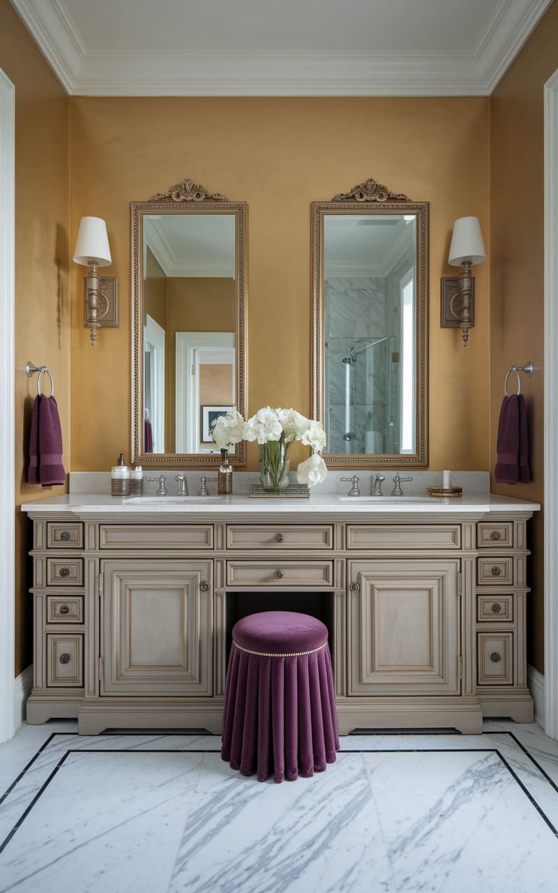The bathroom, a jewel box of Renaissance charm, offered a warm embrace with its ochre walls, reflecting a soft, interior luminescence that danced off the twin gilded mirrors. A symphony of symmetry played out in the dual vanities and sconces, while the plush, plum-colored stool, a velvet punctuation mark, softened the formality of the marble floor and the intricately paneled cabinetry. A quiet opulence reigned, a space where the past whispered elegance into the present.
