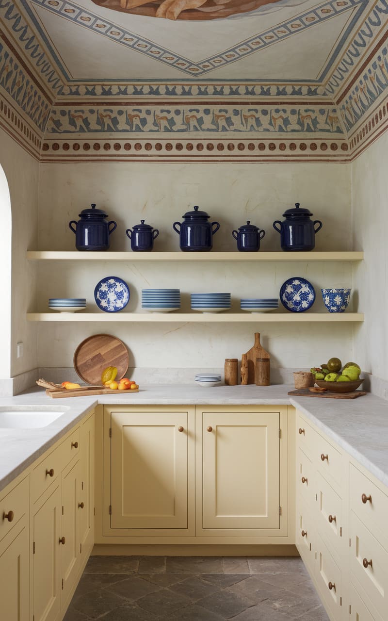 A hushed elegance pervades this kitchen alcove, where the eye is drawn upwards to a frescoed ceiling, its faded figures whispering of classical inspiration. Rows of deep blue pots stand like sentinels upon simple, pale shelves, contrasting sharply with the creamy cabinetry below. The room feels bathed in a soft, diffused glow, perhaps from a hidden window, highlighting the cool, smooth countertops and the rustic stone floor, creating a serene space that feels both timeless and lived-in.
