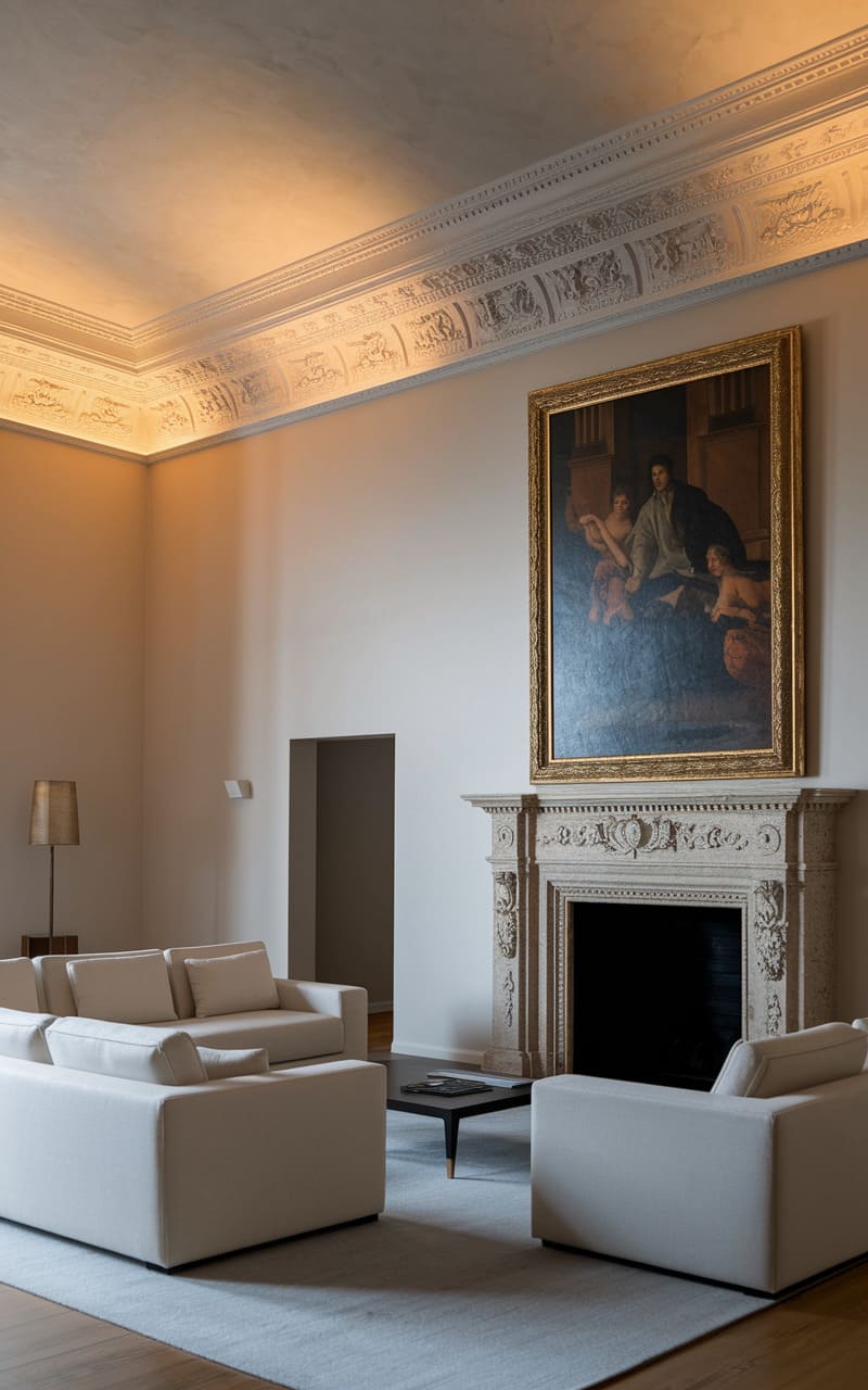A hushed grandeur fills the room, its high, faintly patterned ceiling hinting at a storied past. A monumental fireplace, carved with intricate details, anchors the space, its mantel holding a framed Renaissance painting that seems to observe the scene with quiet authority. Two plush, modern sofas, bathed in a soft, diffused glow, offer a stark contrast to the classical architecture, creating a sense of timeless elegance. The room feels like a stage set for a private conversation, a place where history and contemporary comfort intertwine.