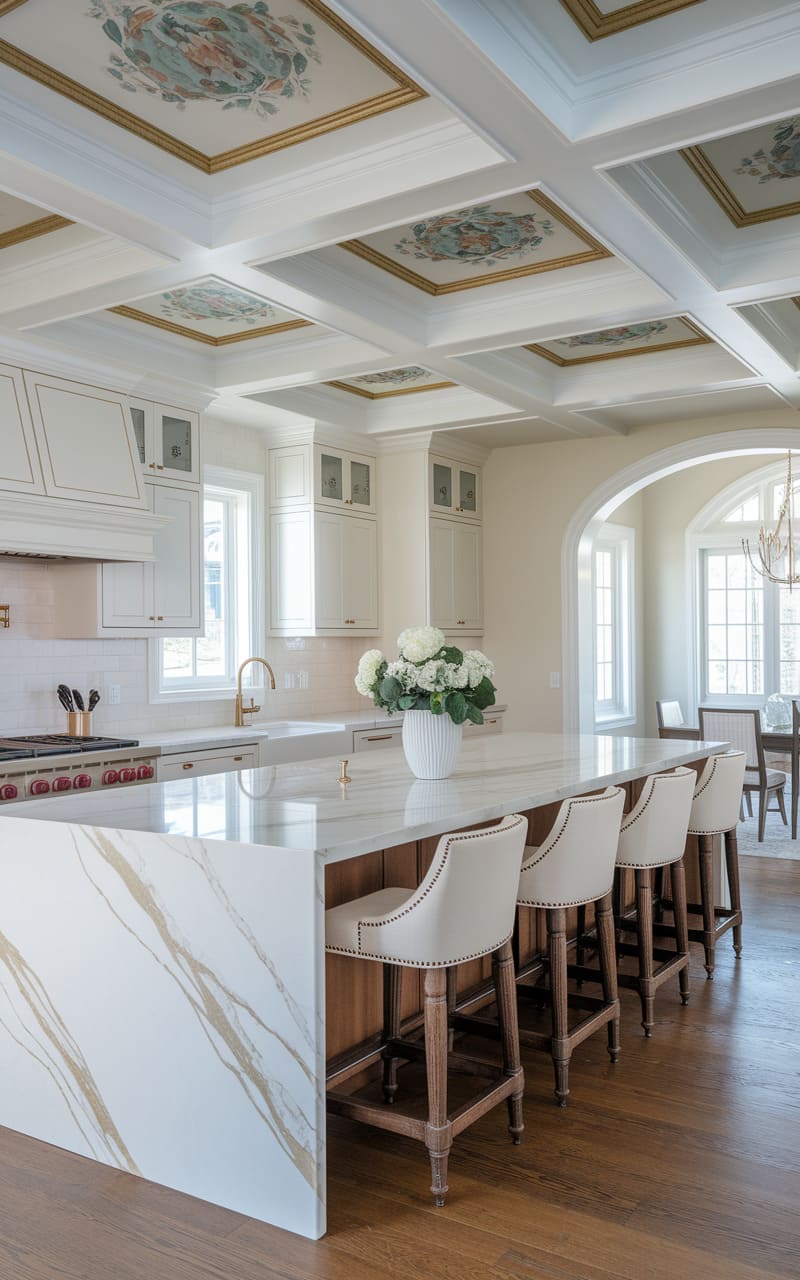 A whisper of old-world charm permeates this kitchen, where a coffered ceiling, each panel a miniature fresco, gazes down upon gleaming countertops and crisp white cabinetry. The room hums with an understated elegance, the subtle veining of the island mimicking the painted flourishes above, while a cluster of creamy blooms centers the space, their soft petals echoing the room’s gentle palette and hinting at the warmth of gatherings yet to come.