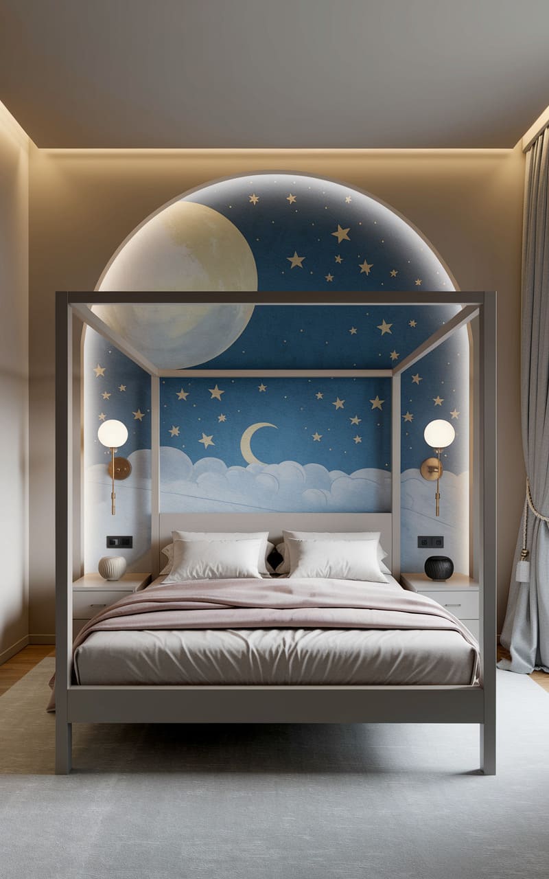 A celestial dreamscape unfurls above a modern four-poster bed, where a painted moon and scattered stars shimmer against a deep blue sky, framed by a softly glowing arch. The room whispers of nighttime magic, with plush pillows and a serene palette inviting slumber, while discreet wall sconces cast a gentle luminescence, hinting at whispered stories and dreams yet to unfold.