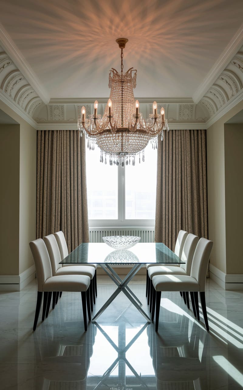 Beneath an elaborate, multi-tiered chandelier that sparkled like a frozen cascade, the dining room held its breath, the cool elegance of the glass tabletop and minimalist chairs a stark contrast to the ornate plasterwork above. A soft, diffused glow, perhaps from hidden wall sconces, washed over the scene, highlighting the subtle sheen of the polished floor and the gentle folds of the draped curtains, creating an atmosphere of hushed anticipation for a meal yet to be served.