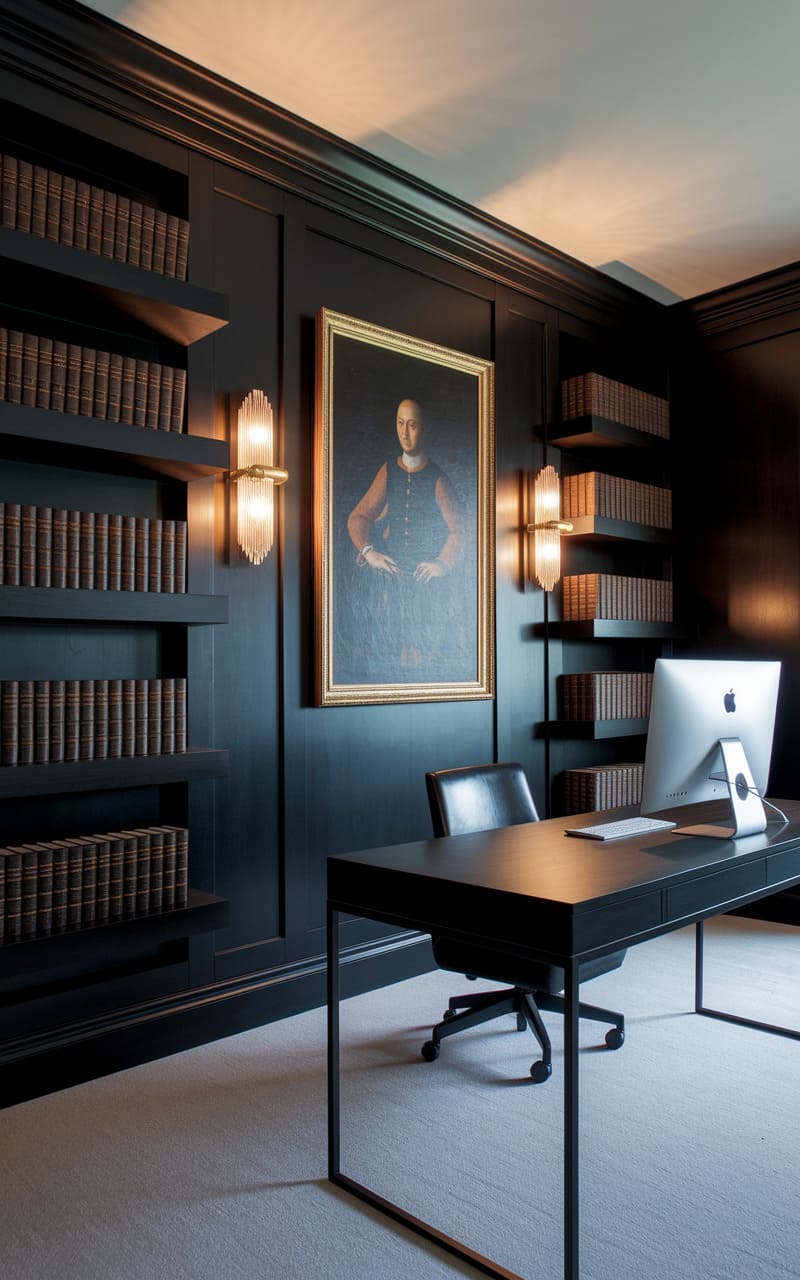 The air crackles with learned anticipation in this study, where a towering portrait of a Renaissance noblewoman watches over a desk cluttered with ancient tomes and modern technology. The deep, midnight-hued walls, adorned with bookshelves brimming with knowledge, create an atmosphere of hushed intensity, while the soft glow of the desk lamp casts a warm light on the polished wood and leather surfaces. It is a sanctuary for the modern scholar, where the past and present converge in a seamless blend of timeless elegance and cutting-edge innovation.
