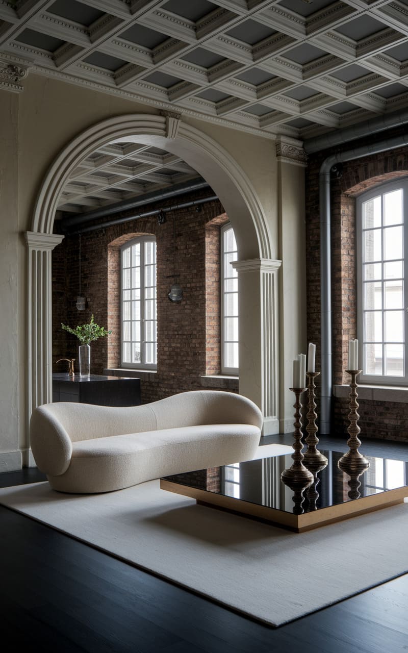 Beneath a coffered ceiling whispering of forgotten grandeur, a sculpted sofa curves like a sigh, its creamy fabric a stark contrast to the rough brick walls that hint at a storied past. An arched doorway, framed by fluted columns, beckons to a hidden space, while a trio of slender candlesticks stand sentinel on a polished table, their metallic gleam reflecting the soft glow that filters through tall, paned windows, casting long shadows across the dark, wide-plank floor. This room is a study in contrasts, where industrial bones meet classic elegance in a hushed, almost theatrical tableau.