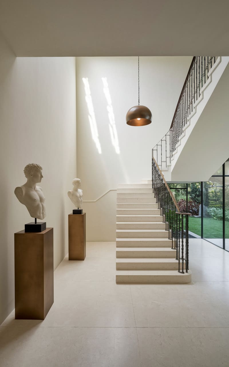 138. Minimalist Entryway with Renaissance Sculptures and Statement Staircase