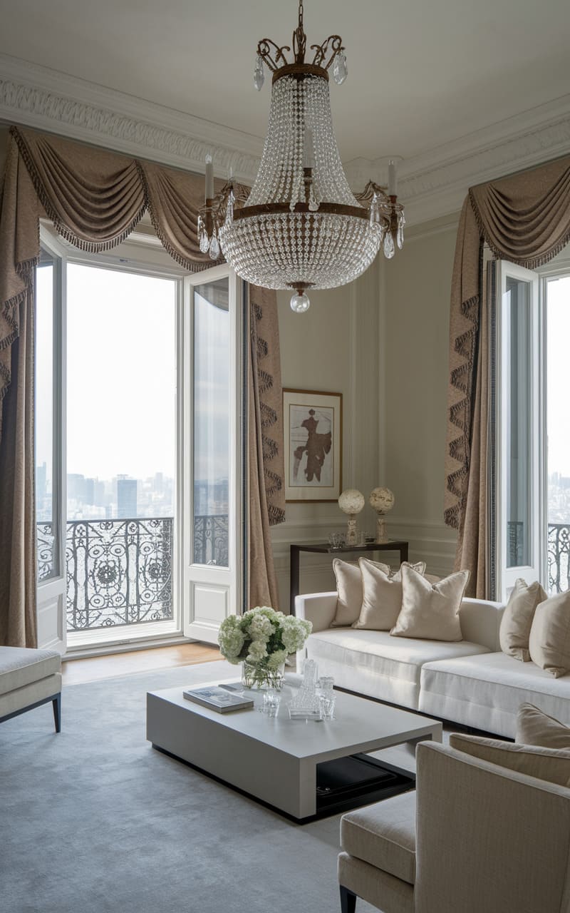 The room breathes with a serene elegance, a Parisian whisper of refinement. A grand crystal chandelier, like a frozen cascade, hangs above a low, minimalist table where a bouquet of white blooms echoes the creamy palette of the plush sofas. Tall French doors, framed by sumptuous drapes, open onto a balcony with a sweeping cityscape view, the muted tones of the urban panorama mirroring the room’s hushed sophistication. The eye is drawn from the delicate tracery of the balcony railings to the subtle sheen of the walls, each element contributing to an atmosphere of quiet luxury, a space where one might imagine whispered conversations and the turning of well-loved pages.
