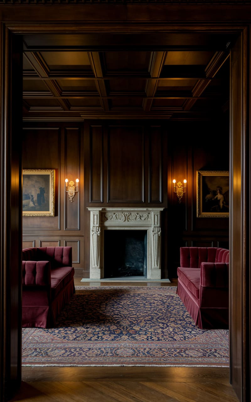 A hushed drama unfolds within this wood-paneled sanctum, where plush crimson settees flank a stately, pale marble fireplace. Deep shadows pool in the coffered ceiling, hinting at untold stories, while twin sconces cast a warm, theatrical glow upon framed canvases, their subjects secrets locked in time. Through the dark, polished doorway, the ornate rug’s intricate patterns seem to hold the weight of centuries, a silent testament to the room’s enduring elegance.