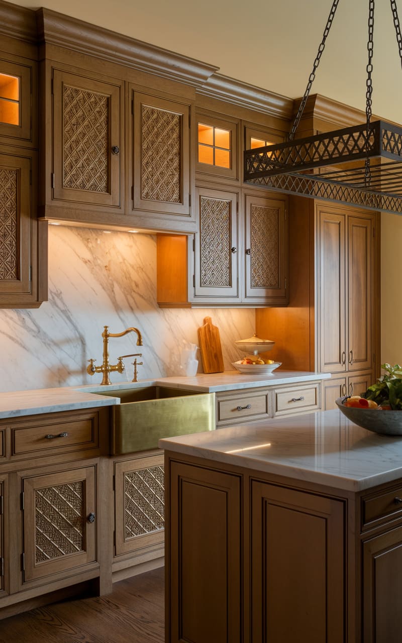 Within this culinary haven, a touch of Florentine artistry lingers amidst the modern comforts. Cabinets, their doors adorned with intricate woven panels, glow with a warm, honeyed hue, reminiscent of aged parchment. A gleaming brass sink, like a captured ingot of gold, anchors the space, while the cool, veined marble backsplash whispers tales of distant quarries. Above, a geometric iron framework, a modern twist on a medieval lantern, casts a soft, ambient glow, illuminating the promise of a feast prepared with both skill and a touch of Renaissance flair.