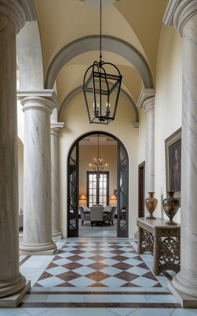 The grand hall whispered tales of bygone eras, its checkered marble floor leading the eye through a series of elegant arches, each framed by imposing, fluted columns. A wrought-iron lantern hung suspended, casting a soft glow that illuminated the warm, creamy walls and the antique console tucked to one side. Through an open doorway, a glimpse of a comfortably arranged sitting room hinted at intimate gatherings, the soft light from within promising a respite from the cool formality of the passage. The entire scene exuded an air of timeless elegance, a quiet grandeur that spoke of centuries past.