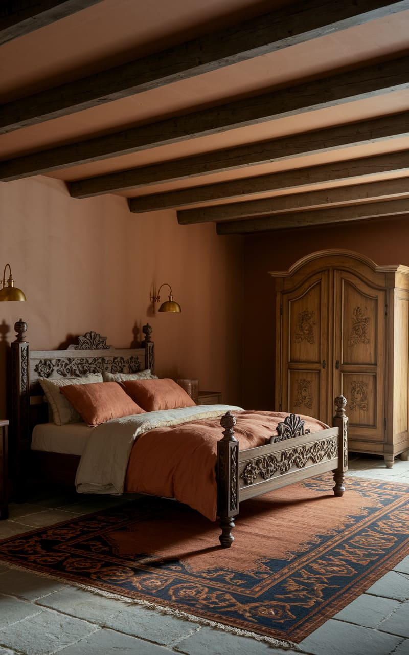 Beneath the rustic embrace of exposed timber beams, a carved wooden bed, draped in terracotta linens, anchors this chamber of quiet repose. The soft glow of sconces casts long shadows across the textured walls, highlighting the intricate details of a stately armoire and the woven richness of a rug that spans the cool stone floor. The room exudes an air of timeless elegance, a sanctuary where stories linger in the still air, a haven untouched by the clamor of the outside world.