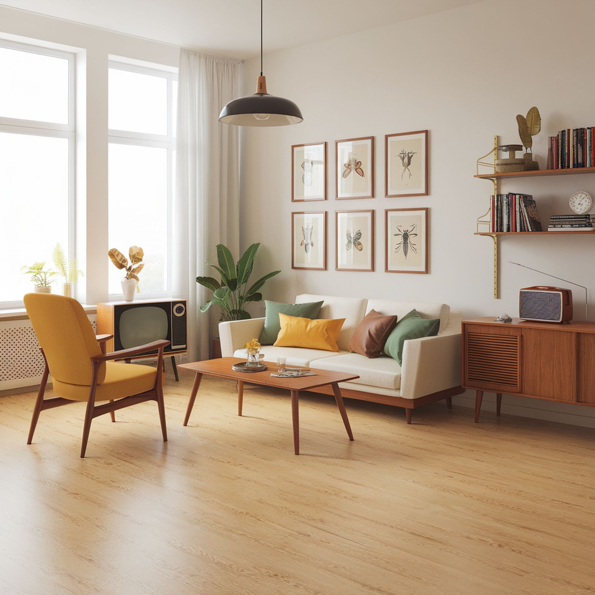 The choice of flooring can have a considerable impact when accenting with retro appeal. We’ve already mentioned checkered patterns and those would fit nicely for the floor. Natural wood works well when paired with shag carpeting. There are many textures that can add a solid effect to any retro interior. We especially like smooth plastics and soft vinyl.