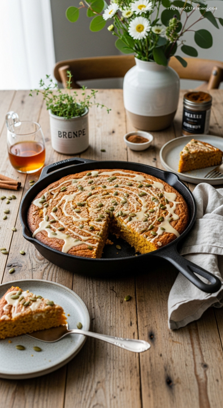Cool the cake in the skillet on a rack for 10 minutes. If glazing, whisk powdered sugar, maple syrup, a pinch of salt, and 1–2 teaspoons milk until thick but pourable. Drizzle over the warm cake so it sinks slightly into the cracks and sets glossy.