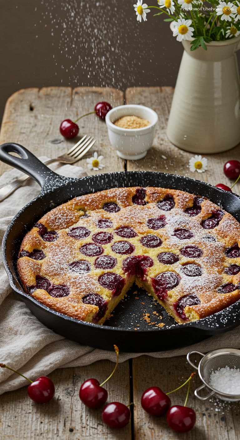 Let the clafoutis cool for 5–10 minutes to set the custard. Dust with powdered sugar. Slice and serve warm or at room temperature, with crème fraîche or softly whipped cream if you like.