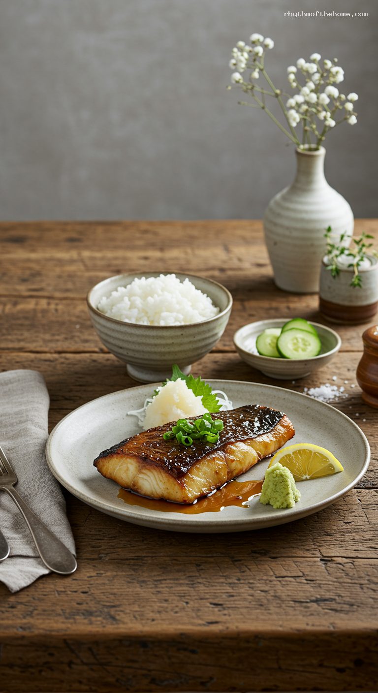 Let the fish rest 3 minutes. Serve each fillet with a scoop of hot rice, a small mound of grated daikon, and a spoonful of pickles. Add a lemon wedge and garnish with scallions or shiso if using. Enjoy immediately while the exterior is caramelized and the flesh is buttery and flaky.