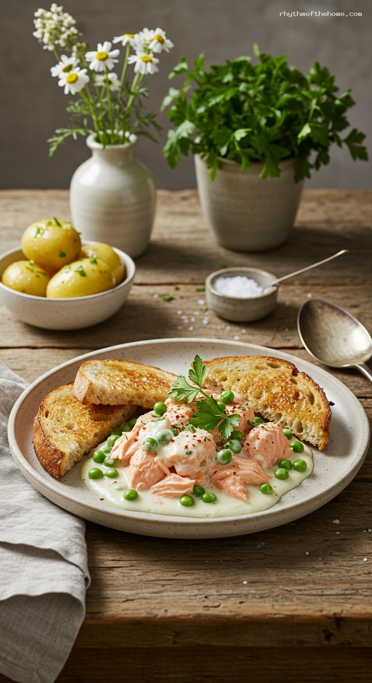- Classic comfort: silky cream sauce, sweet peas, and tender salmon over crisp toast or buttery potatoes.
