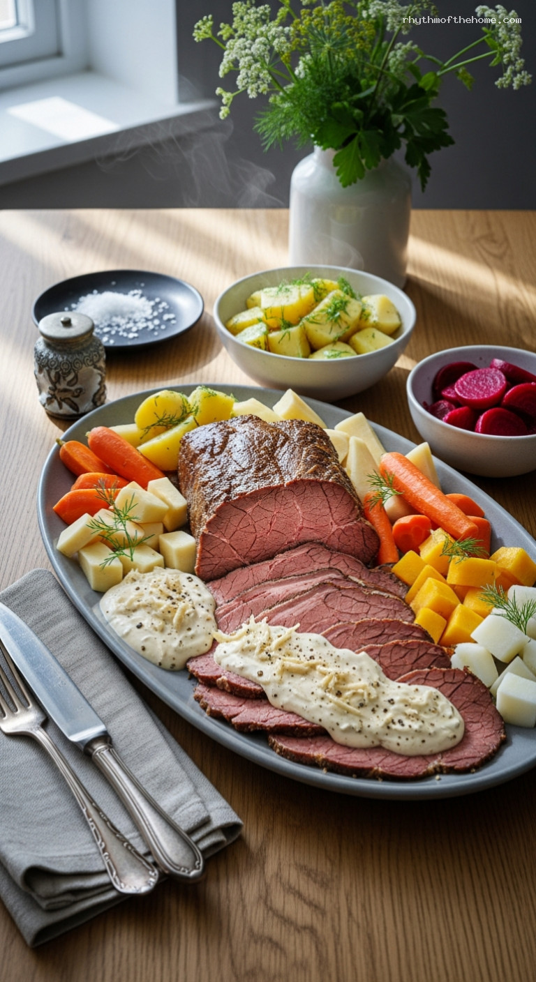 - Produce: 1.5–1.8 kg beef brisket, onions, garlic, carrots, parsnips, rutabaga (swede), leek, waxy potatoes, fresh horseradish root, lemon, dill, parsley, pickled beets (jar)