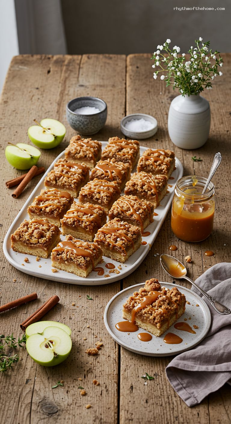 • 6) Assemble: Spread apples over base, top with crumble. Bake 35–40 minutes until bubbling and golden. Cool 1 hour, drizzle warm caramel, sprinkle flaky salt, slice.
