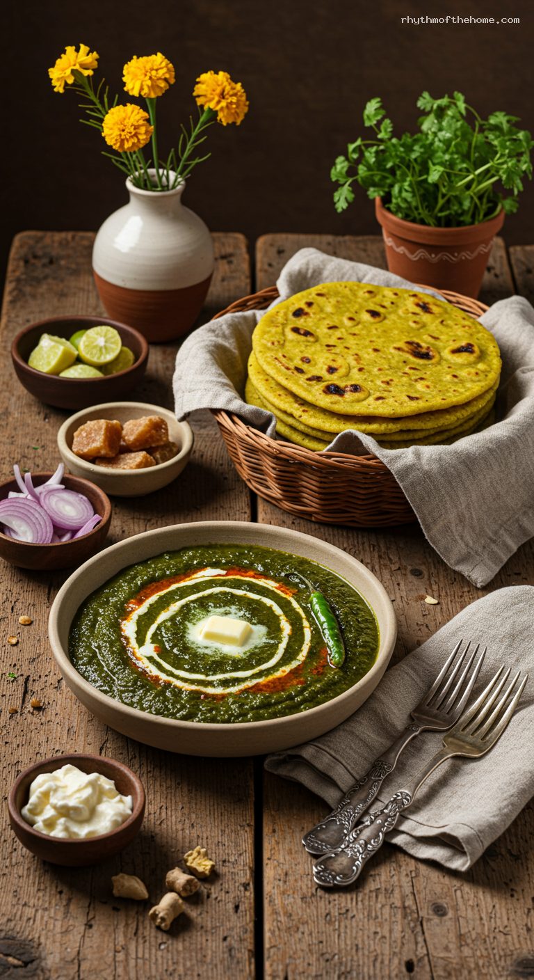 - Pantry: Makki ka atta (cornmeal/maize flour), cumin seeds, Kashmiri red chili powder, turmeric, asafoetida (hing), mustard oil, garam masala (optional), jaggery, salt.