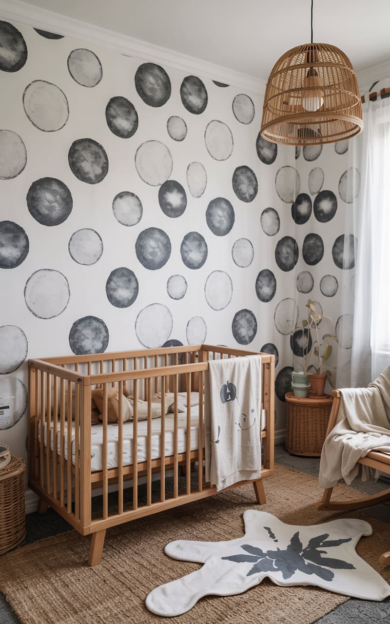 A whisper of the wild graces this nursery, where charcoal leaves unfurl across a pale wall, hinting at enchanted forests. A simple wooden crib anchors the space, its soft drape suggesting cozy slumber. Overhead, a woven pendant casts a gentle glow, while a plush rug underfoot invites tiny toes to explore. The room feels like a quiet promise, a haven where dreams take root and grow.