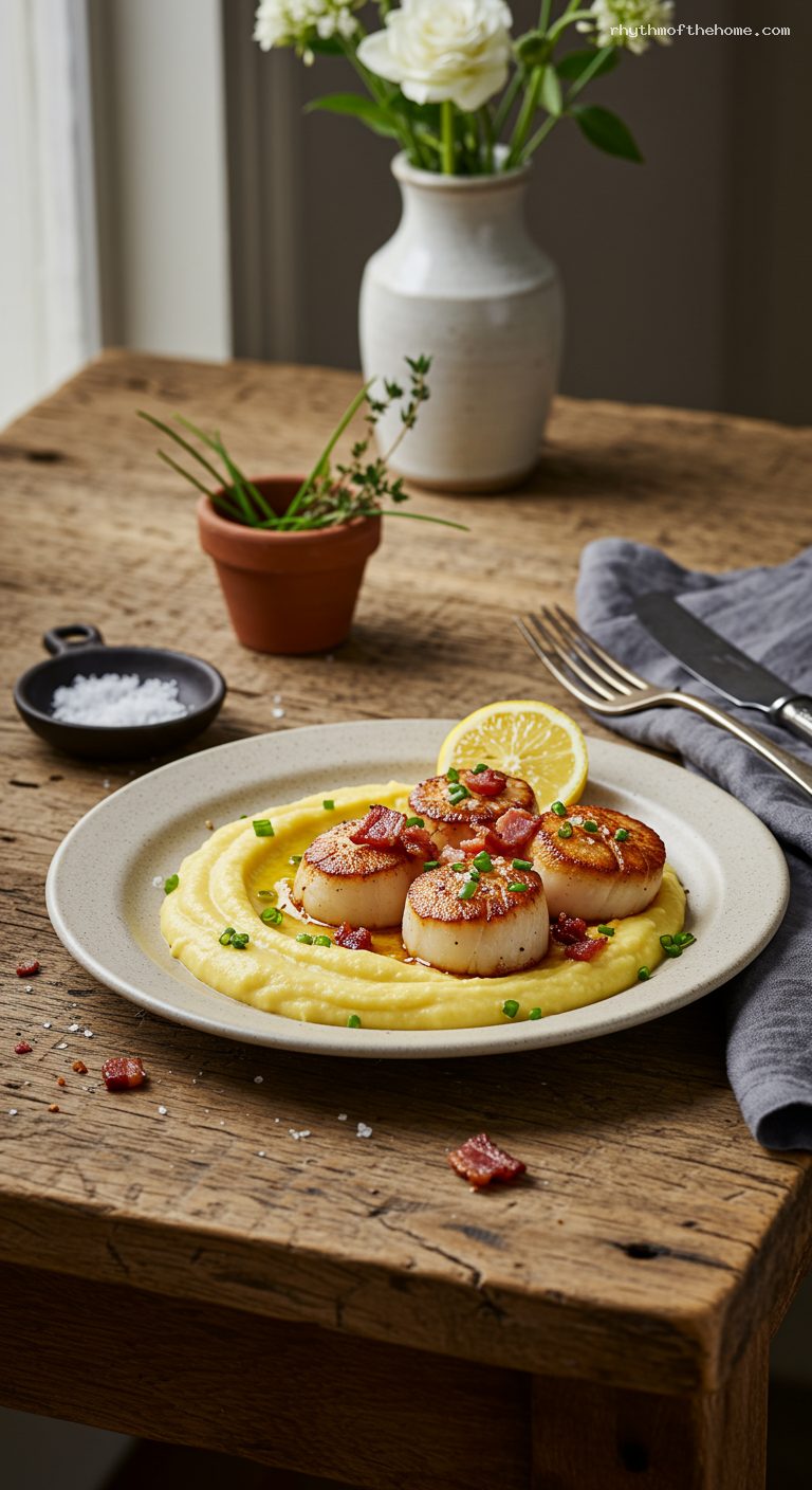 The corn purée can be made up to 2 days ahead; cool, cover, and refrigerate, then rewarm gently over low heat with a splash of stock or water. Bacon can be cooked and crumbled up to 2 days ahead and kept refrigerated. Scallops are best seared to order; leftovers can be refrigerated up to 1 day and reheated very gently (low heat, 1–2 minutes) to avoid overcooking. Do not freeze the purée for best texture.