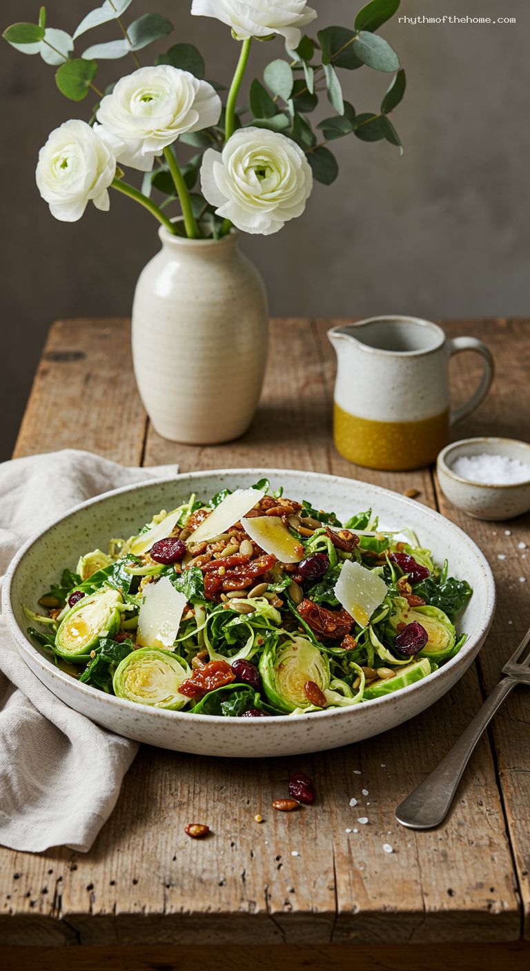 Pour the vinaigrette over the greens. Toss thoroughly to coat every strand. Gently massage the greens with clean hands for 1–2 minutes—this helps the kale and Brussels sprouts relax and become more tender. Let the salad rest for 10 minutes so the flavors meld and the greens soften.