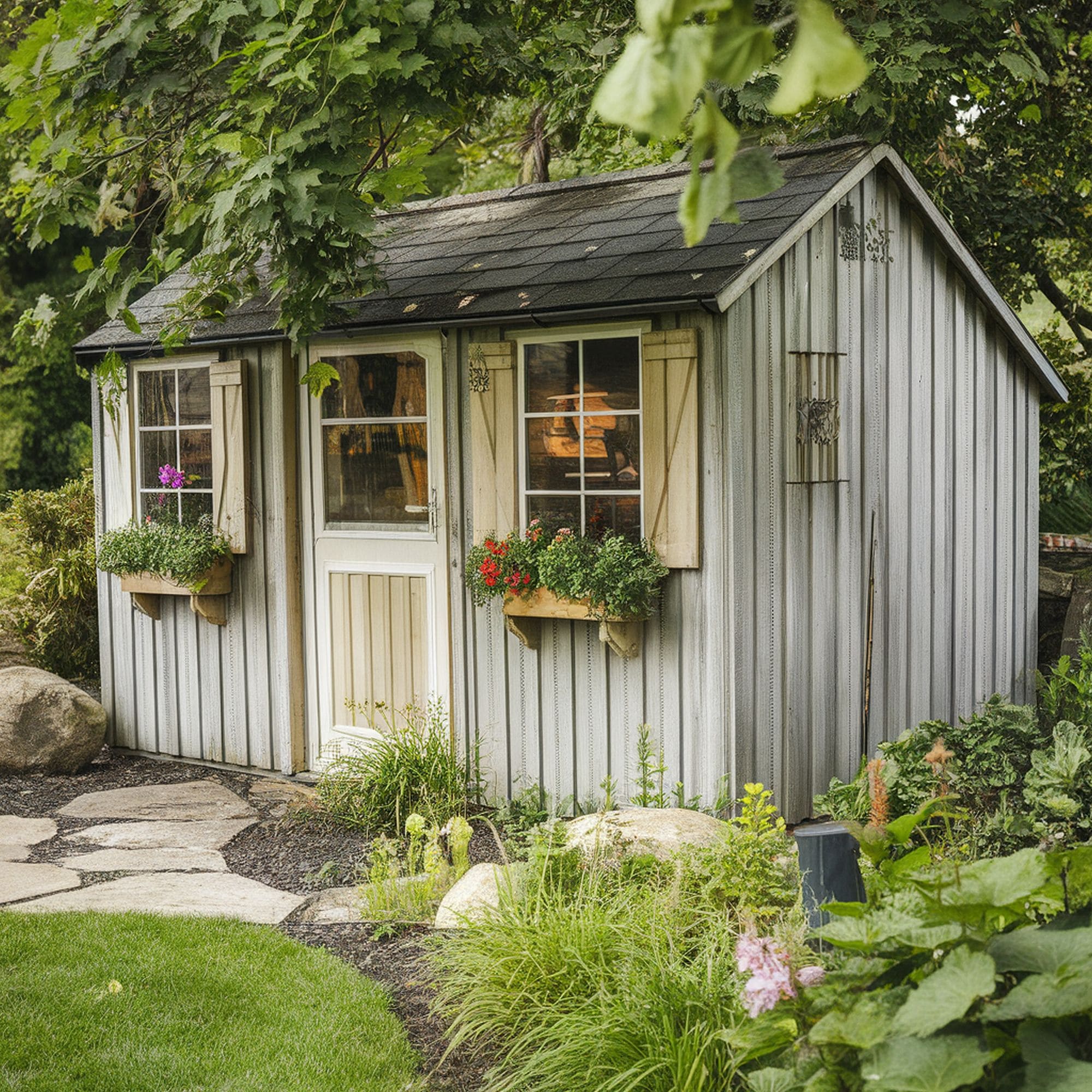 If you prefer a traditional she shed design, you should try decorating with many cottage-style elements and accessories. Bring a touch of romance with the help of charming furniture upholstering and pillow covers featuring floral patterns. Incorporate some vintage decor items such as flowing curtains, lamps, or baskets. In terms of color palette, it’s recommended to focus on pastel tones or pops of color contrasting against a neutral-toned background. Although this is a really small shed, it packs quite a visual punch with all of its attractive decorations extending towards the exterior of the structure.