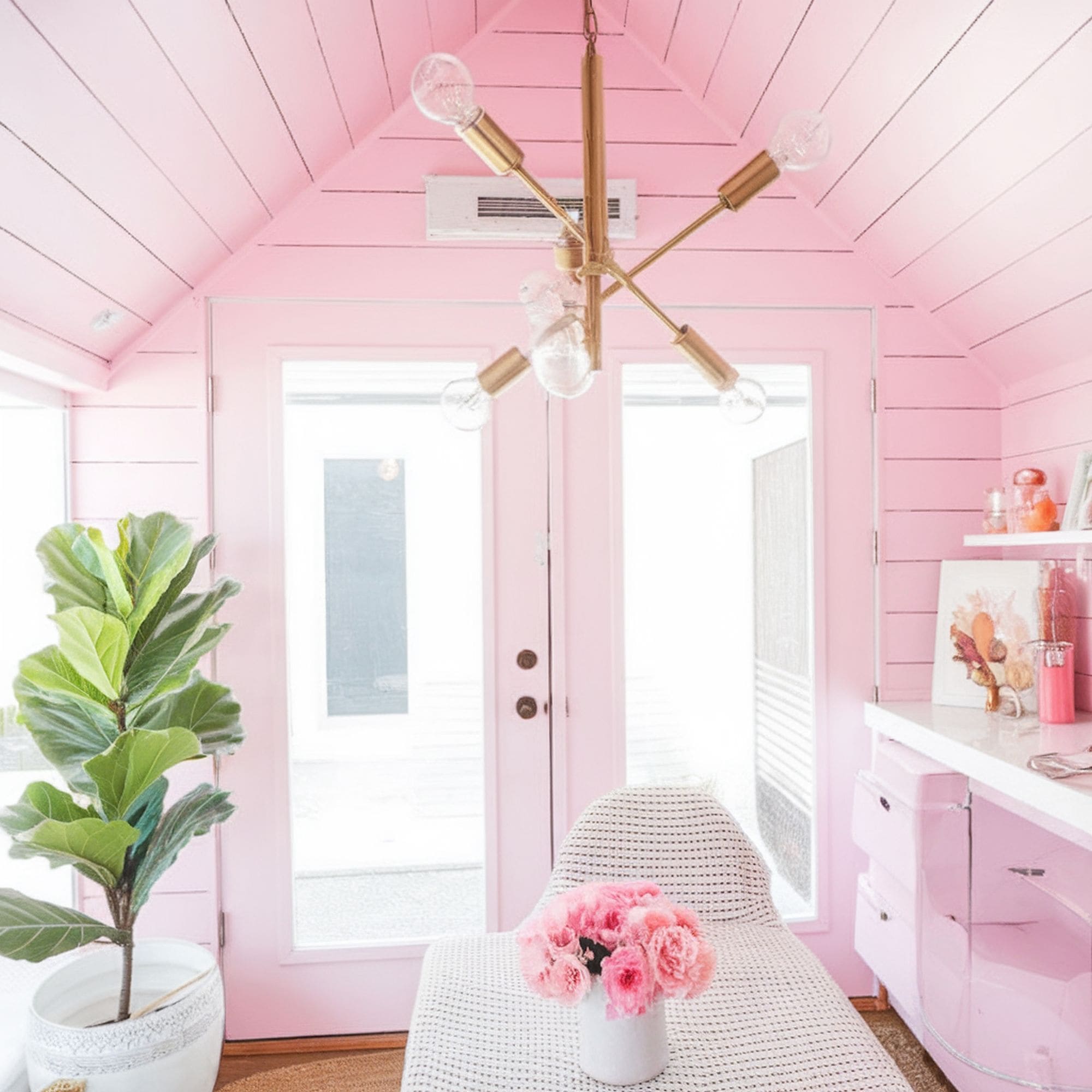 Pink represents a great pick for any she shed color scheme. By selecting the right shade, you will be able to induce a sense of fun mixed with an air of calmness. Pale pink walls bring solid feminine appeal to the she shed. You can feel a welcoming vibe just from opening the door and entering this kind of space. Add some gold elements, such as an elegant light fixture, to make the pink tone feel more glamorous. If a full pink makeover seems a little excessive for your tastes, consider using this color only sparingly through well-picked accessories.
