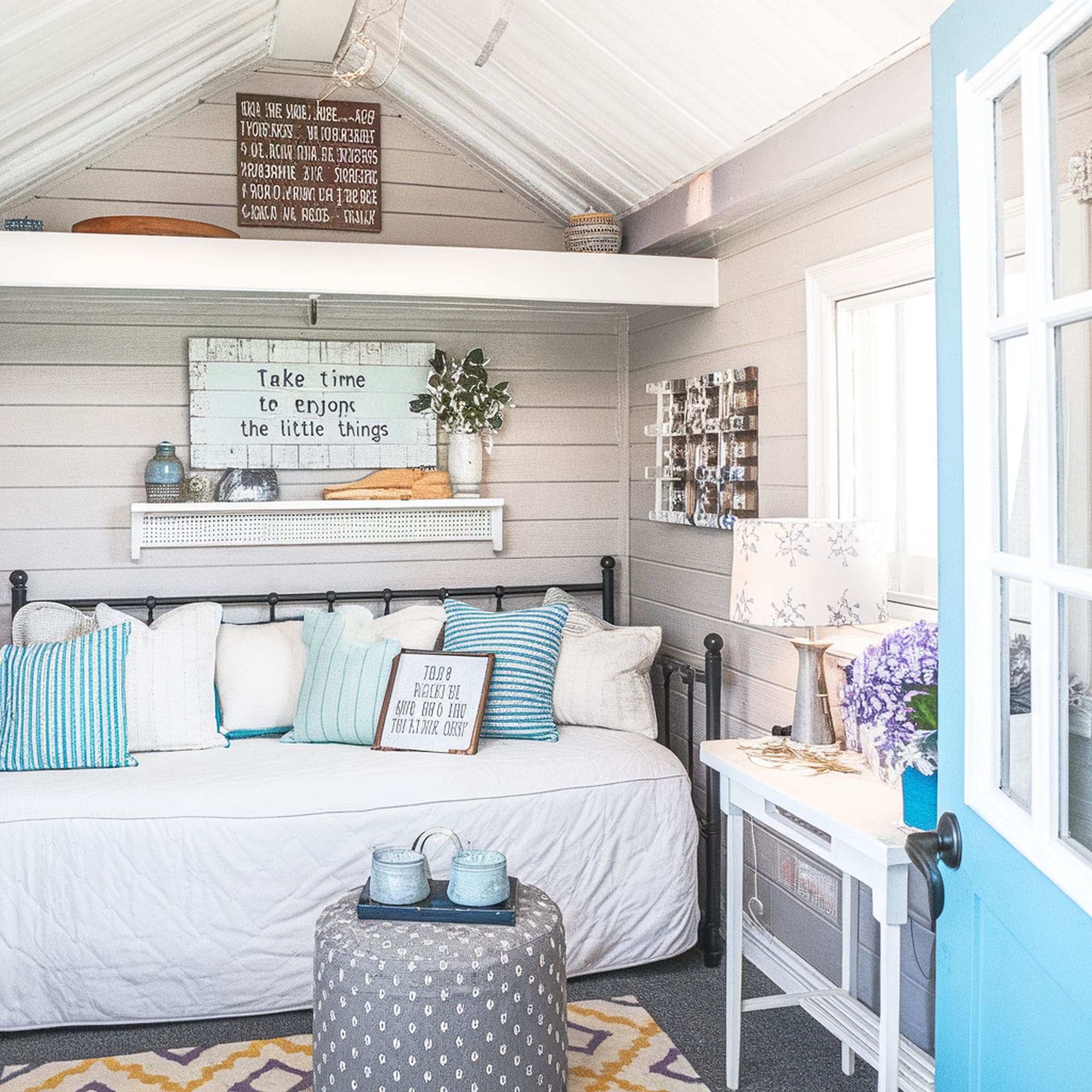 Although she sheds are usually intended as personal spaces that meet your needs, you can also design them for other purposes. A great example is creating a guest house for those times when you need an extra sleeping space. Decorate the shed to make it as welcoming as possible while ensuring a comfortable sleep with the help of a daybed or futon. Privacy is important for a guest house. Make sure the windows are equipped with shades or curtains. Bright lighting fixtures are also important to infuse the she shed with an inviting vibe.