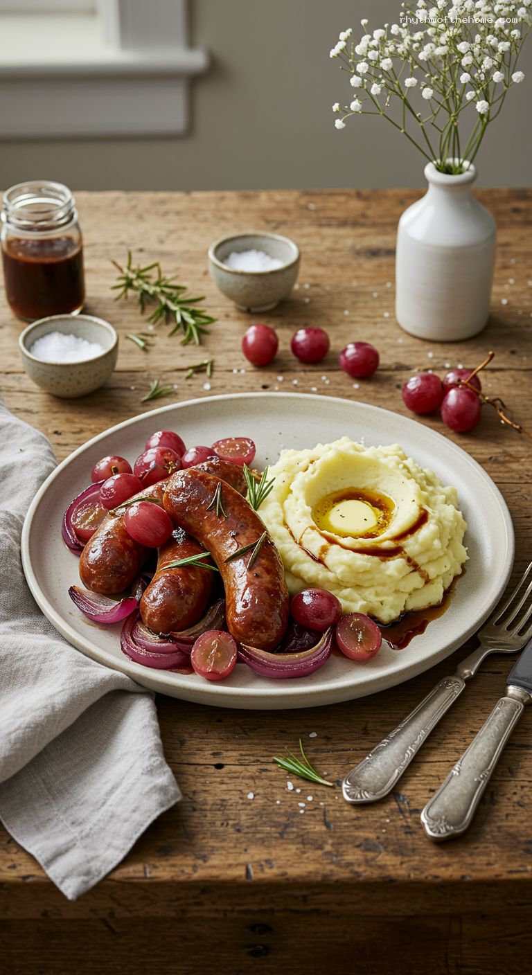 • 6) Brush sausages with balsamic gloss; toss grapes/onions with a little. Serve beside garlicky mash; garnish with rosemary.
