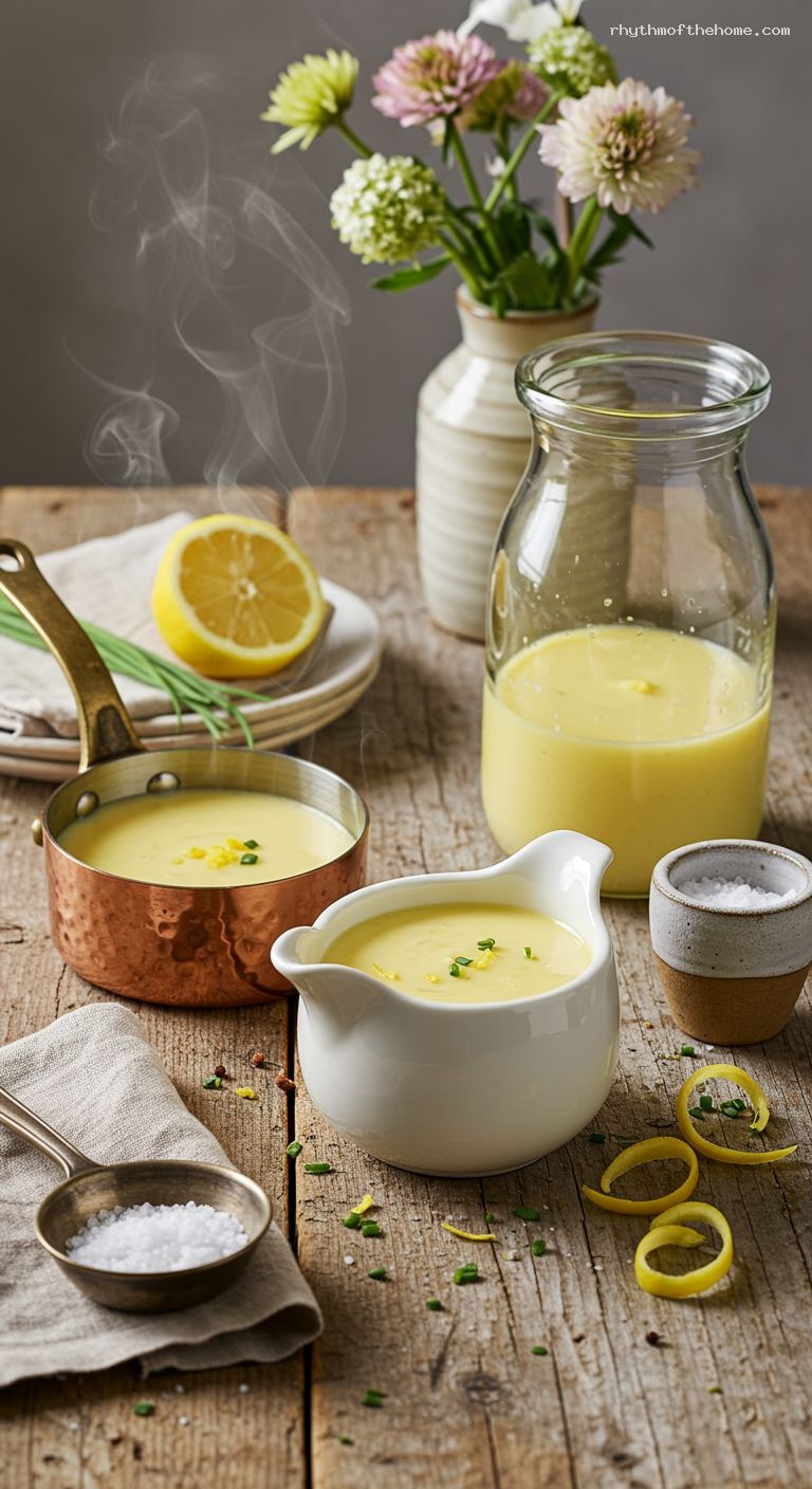 - 6. Whisk in lemon juice, salt, and white pepper. Serve warm; do not boil.