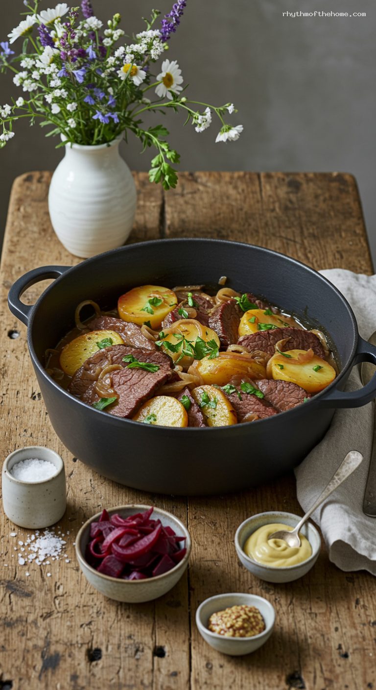 • Pantry: Neutral oil, malty beer (dunkel/amber lager), low-sodium beef stock, bay leaves, allspice, dried thyme, kosher salt, black pepper, pickled beets, sharp mustard