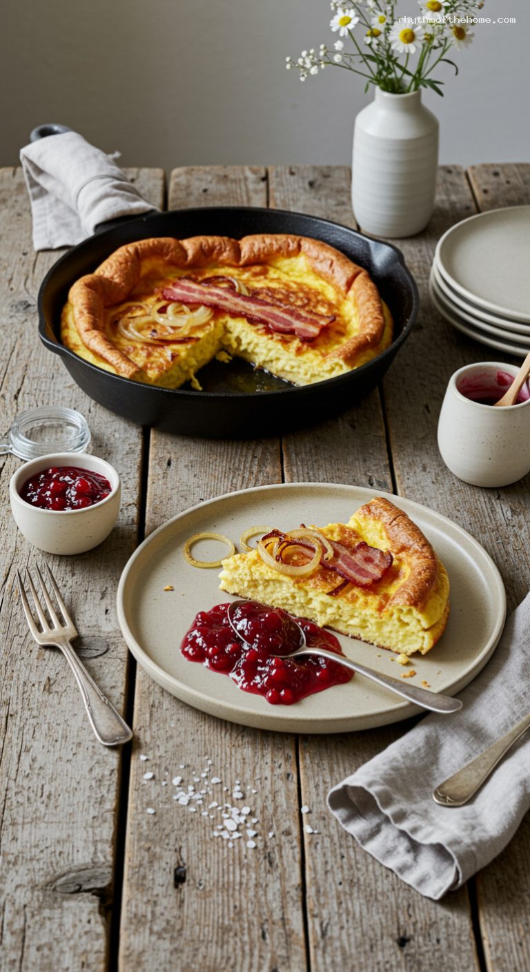 - 5) Whisk batter, pour over onions; scatter bacon evenly. Bake 20–25 minutes until puffed and set.