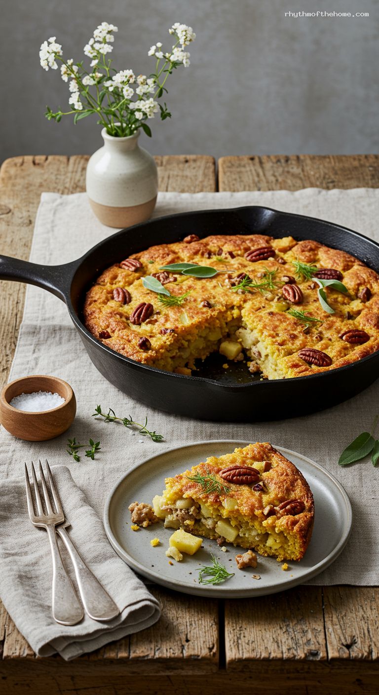 Skillet Cornbread Stuffing with Sausage, Apple, and Pecans