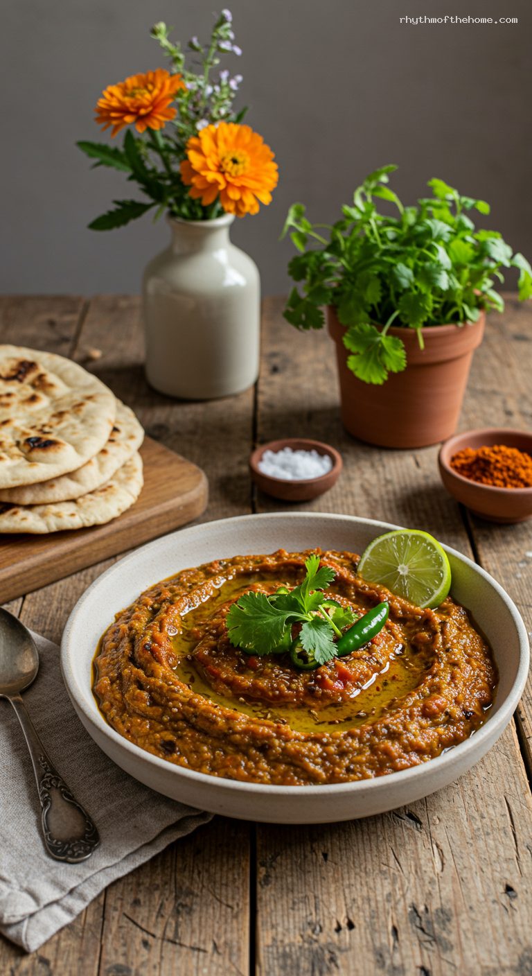 Refrigerate in an airtight container for 3–4 days. Freeze up to 1 month; thaw overnight in the fridge. Reheat gently over medium-low, stirring in a splash of water as needed. Add fresh cilantro and lime after reheating to brighten flavors. For make-ahead prep, char and mash the eggplants up to 2 days in advance and store refrigerated.