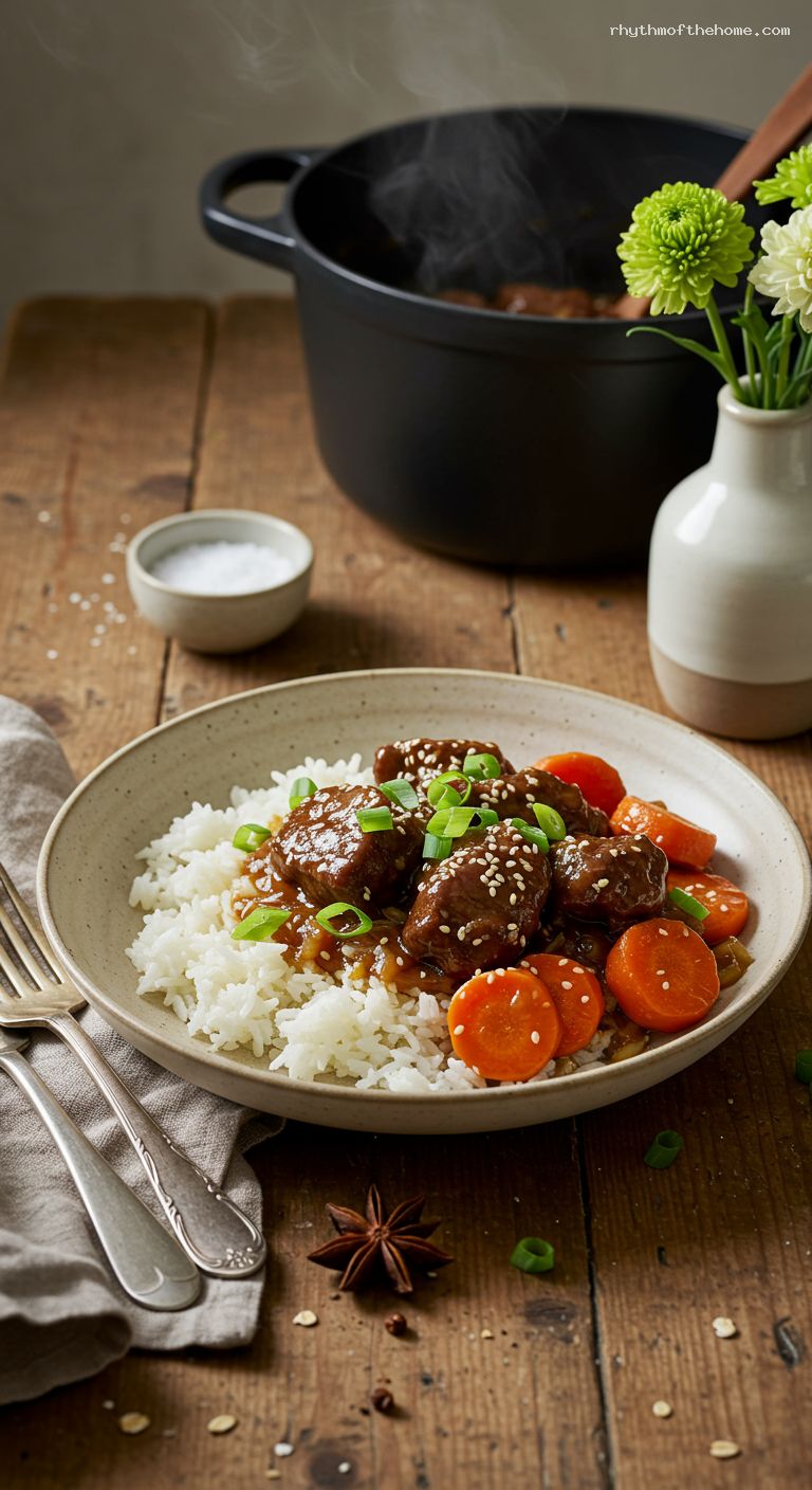- Pantry: Beef chuck (2 lb), jasmine rice, neutral oil, low-sodium soy sauce, dark soy (optional), brown sugar, rice vinegar, low-sodium beef broth, star anise, toasted sesame oil, kosher salt, black pepper, sesame seeds (optional)