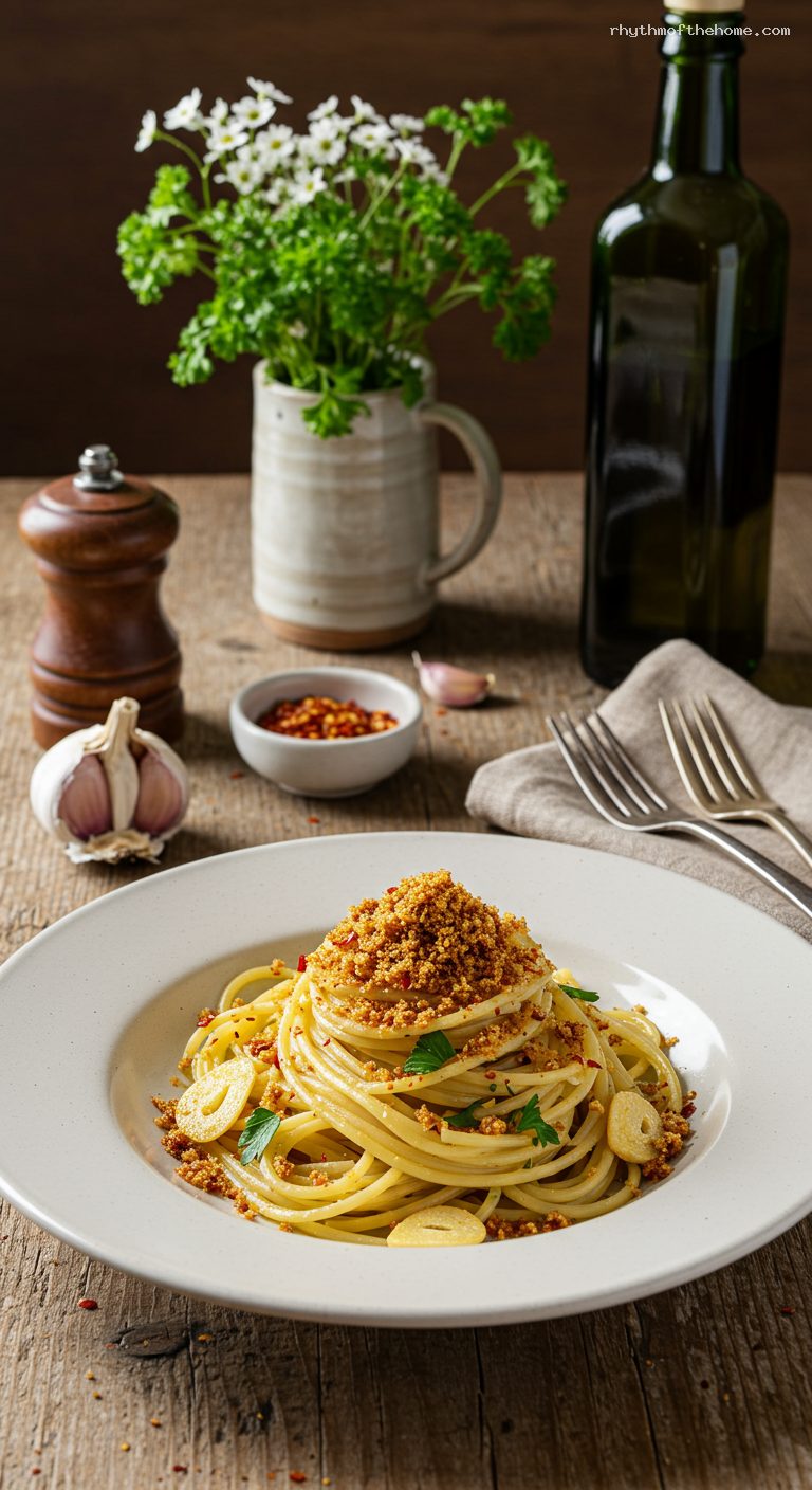 Twirl the pasta into warm bowls. Shower each portion generously with the toasted breadcrumbs right before serving so they remain crisp. Serve immediately.