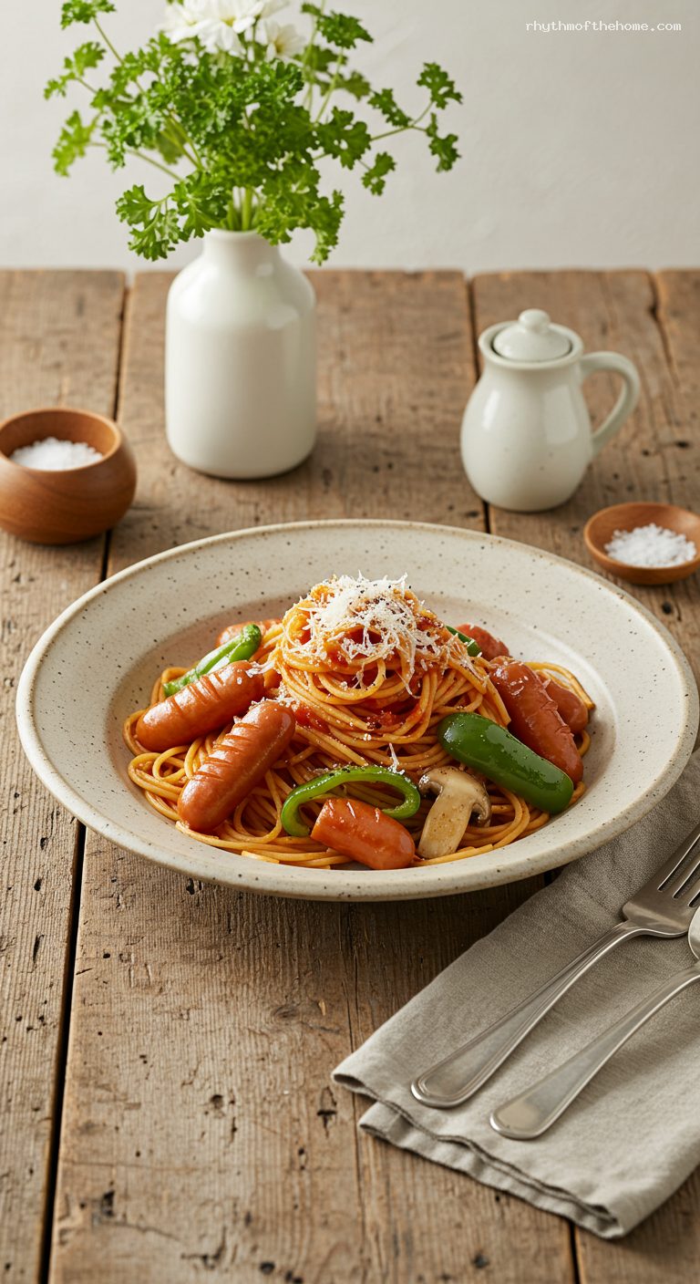 - Balanced textures: springy spaghetti, tender onions, snappy peppers, and browned sausages.