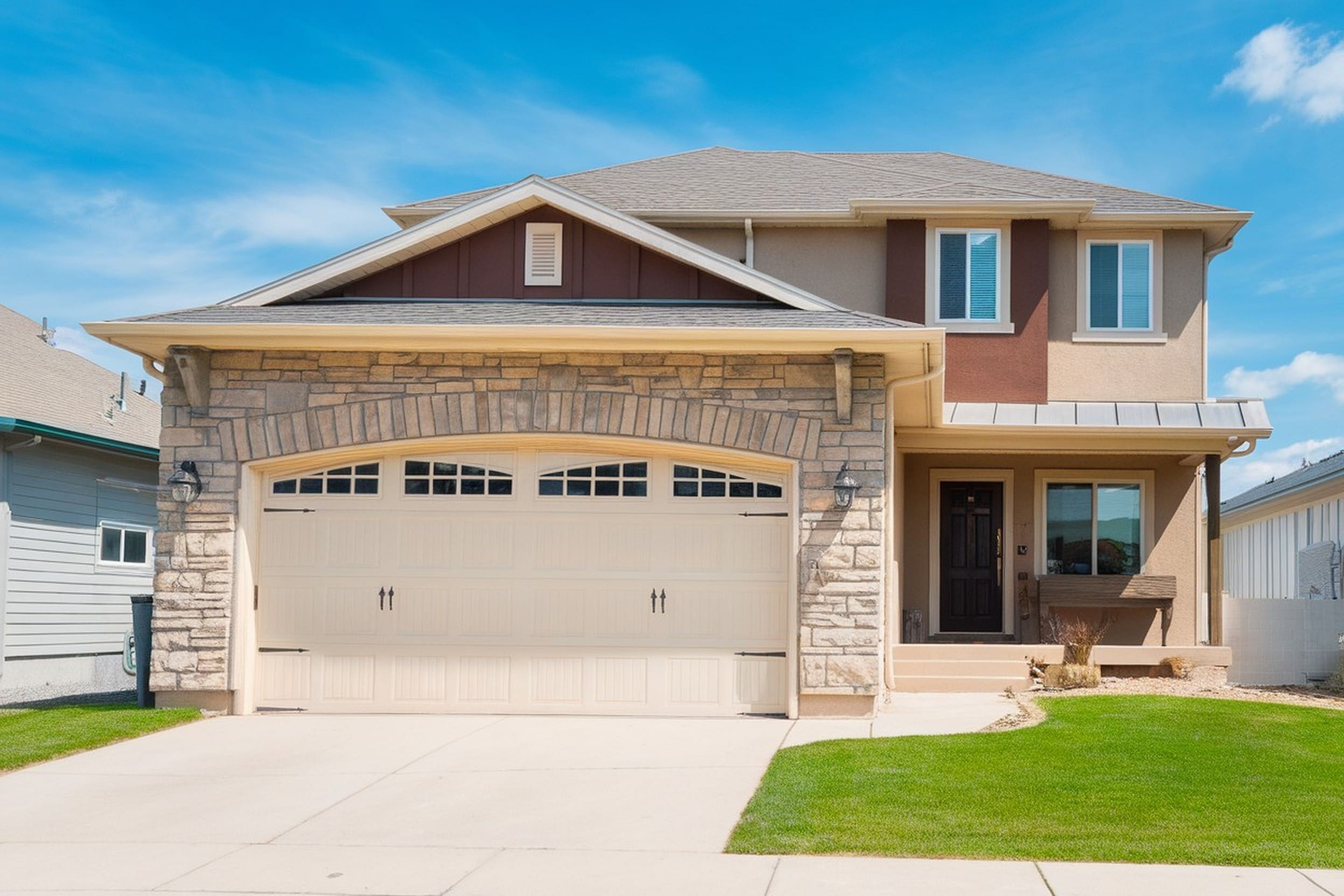 Living in the suburbs without a car is extremely challenging. It’s not surprising that many homeowners choose to emphasize the garage of a split-level house. In this example, the attention is quickly drawn to the large garage in the front of the home. It uses multi-hued rock siding while the light-toned door seems to create a welcoming effect.